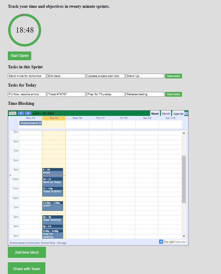 I also built myself a simple tool for being more productive during the work day. A while back I started using Google Timer for twenty minute “work sprints”. I pick a task that I want to get done, set the time, and work on that task for twenty minutes straight. After the timer goes off, I take a three to five minute break before repeating. It has been super helpful with getting more done, but I have to use several tools to do this: Google Timer, Notion for my tasks for the day and for the twenty minute sprints, and my calendar for blocking out my entire day. So instead of that, I built myself a simple dashboard via Replit that combines all three of these on one page.