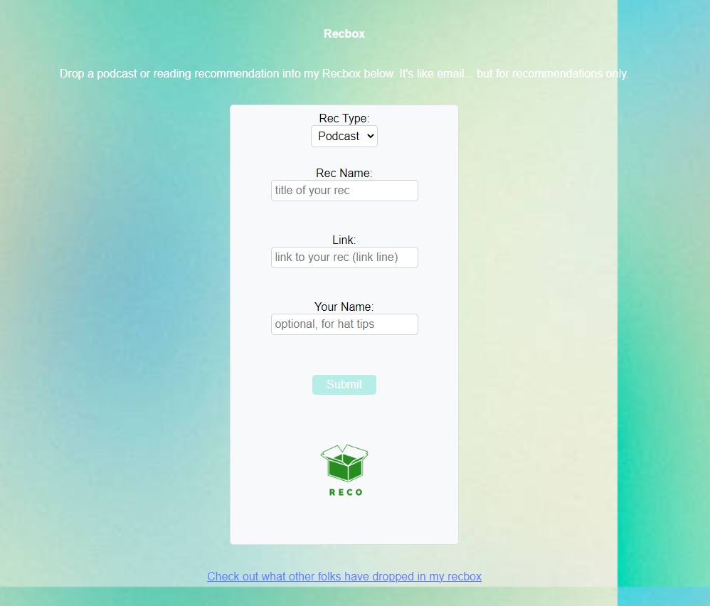 The idea of Reco is in the same idea family as Reading This and continues my exploration of recommendations and sharing the digital content you are loving with other people. Reco is like email, but for recommendations only. Each user gets a public “Recbox” where other people can drop reading or podcast recommendations into. The recs that get dropped into your Recbox then make into an email like dashboard for you to view and you can decide to display the best ones publicly.