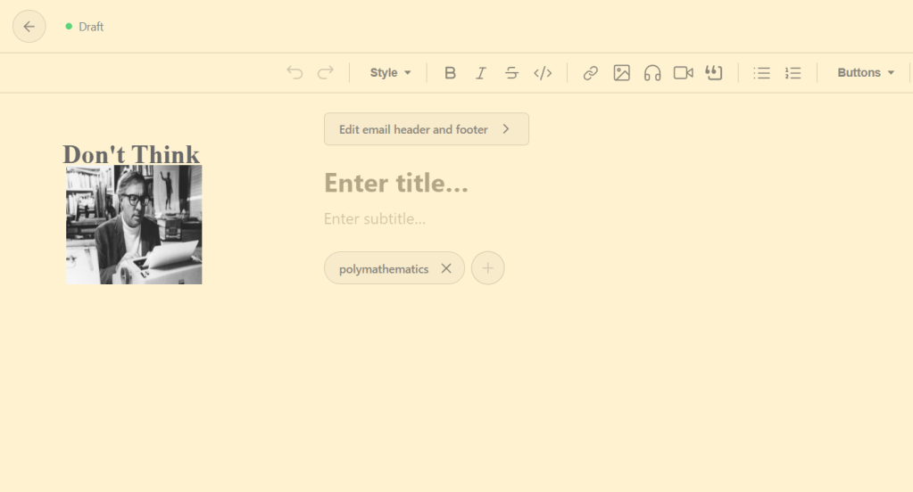 All it does is add “Don’t Think” (and a photo of Bradbury) to your WordPress or Substack post editors. It was inspired by a sign with the same words Bradbury had hanging over his typewriter for more than twenty years. The idea is to avoid over-intellectualizing or controlling what you want to say in order to make room for your authentic feelings. This is now available in the Chrome store.