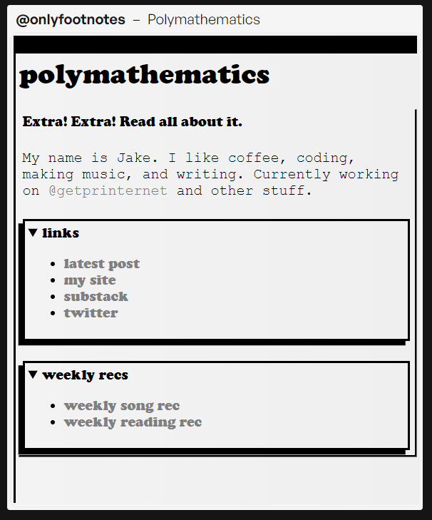 A fantastic overview of an alternative to Twitter and other timeline based social media protocols. This inspired (at least in part) Twilight, the project listed below and is welcome company with my continued thinking of how to make the internet cooler.